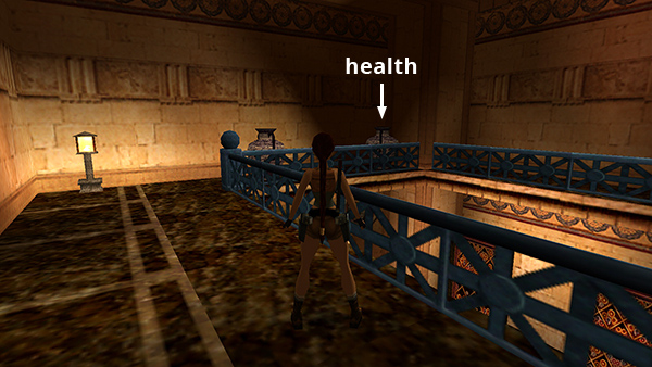ARCHIVES – FIRST ROOM WITH LADDER: This small room contains several stone benches. There are scrolls scattered about and more scrolls stored in shelves lining the walls. Climb the ladder to the upper level. (screenshot) Go around to the opposite side of the balcony and shoot the vases. The second one contains a small medipack (21). (screenshot) Climb back down the ladder.