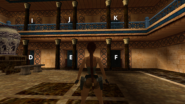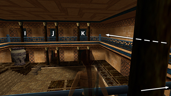 Follow the hall opposite the ladder, smashing another ceramic vase in the hallway to get some Uzi ammo (22). (screenshot) Go through a SECOND ROOM WITH BENCHES AND SCROLLS (screenshot), continue down the stairs, and follow the hallway to the end. Push open the blue door (marked G in the diagram) to emerge on the UPPER LEVEL OF THE MAIN HALL. Turn right and follow the balcony around to the other side of the room. (screenshot)
