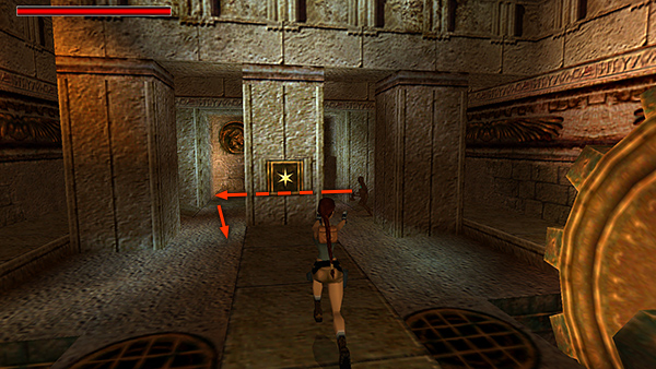 DOOR K – ROOM WITH LIONS' HEADS: Go through the right door on the upper level, south side. Light a flare and save the game before sliding down the ramp. As you slide, jump to grab the ladder above and in front of you just before the end of the ramp. Climb up to emerge on top of a huge statue of a lion's head. You'll hear a rumbling as a metal globe rolls down the ramp on the opposite side of the room. You're safe up here. Take a running jump from the top of the lion's head to the long ledge on the right (west) wall. This is SECRET #3 (52/70), a large medipack and normal arrows (23-24). Safety drop to the ground. (screenshots)