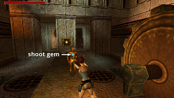 ROOM WITH TWO HUGE GEARS – FIRST GOLDEN STAR: As you enter the room at the top of the steps, a mechanical man (1) swinging an axe emerges ahead on the right. (screenshot) This new enemy type can be challenging to defeat since explosives can't harm him, and his metal hide repels bullets. The aquamarine gem in his chest is his vulnerable spot. (screenshot) Sometimes but not always, you'll hear him grunt when you score a direct hit, and he'll let out a longer groan when he's about to fall, so you can stop shooting. If you run to meet him as he comes around the center pillar toward you, then hop back firing, you can take him out with 4-5 wideshot shotgun blasts at close range, a few more regular shotgun blasts, or about 25 direct hits with the pistols. If you're using pistols, keep firing as you hop back. Then, when the mechanical man gets close, jump past him, roll, and start backing up while shooting again. Don't let him back Lara into a corner. Once you've taken care of him, use the crowbar to pry the GOLDEN STAR (4) out of the column. (screenshot)