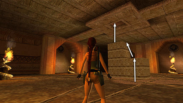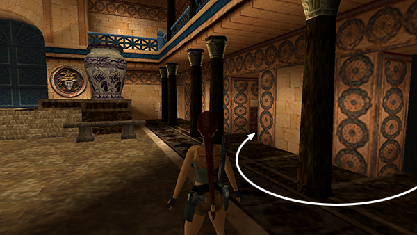 To get past the next blade, walk to the edge, hop back once, and then take a standing jump to grab the pole, climb up three times, wait for the blade to move to the front right corner (so it's about to pass in front of Lara), and then quickly climb up twice and backflip. Or, stand at the edge of the opening, wait for the blade to move to the far right corner, then take a standing jump to grab the pole and immediately backflip onto the ledge above and behind. Shoot the ceramic vase for a small medipack (1) if you didn't get it earlier. Next, position Lara so she's facing west or south, so there's no wall behind her on the upper level. Then repeat the sequence described above to get past the third blade. Follow the corridor back to the MAIN HALL. (screenshots)