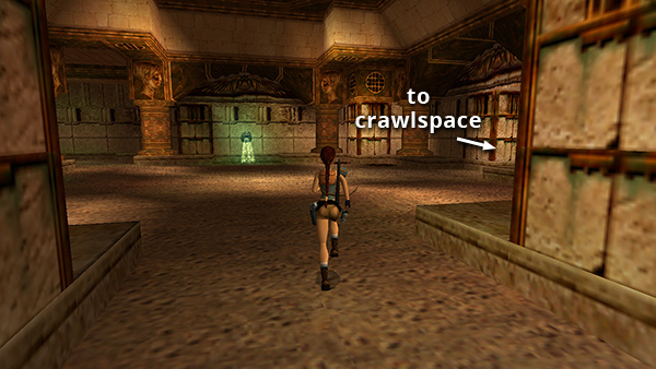 MAIN HALL (again): Lara will probably have lost some health climbing up the pole past the blades. If you like, you can return through the corridor to the west (screenshot), climb into the raised crawlspace where you first entered this level, and follow the passageway back to the TEMPLE OF POSEIDON. Whenever you change levels, Lara's health is restored. Return through the crawlspace to the LOST LIBRARY and proceed.