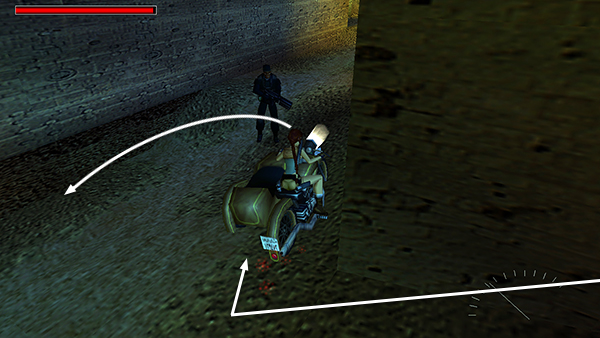 Park the motorcycle just to the right of the entrance to the building. Make sure it's pointing to the east. Later you'll exit the building through the chute above on the left. Positioning the bike this way will allow you to make a quick getaway. Now enter the building. (screenshot)