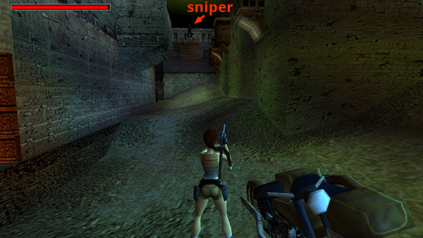 Kill the soldier (6) lurking inside on the right. Get the revolver ammo (9) he drops. Then roll to face the left side of the alcove. If you didn't meet it earlier in the alcove with secret #1, a giant beetle (5) will fly up from below. (Again, this enemy may be invisible in the patched PC version of the classic game, but it can still hurt Lara. Fortunately, she'll still aim at it so you can shoot it.) Grab the large medipack (10) sitting in the left corner. (If you killed the soldier and took the items earlier, you'll still encounter the beetle, since it only spawns after you use the lever.) Drop through the hole in the floor and slide down the ramp to the street below. The motorcycle should be parked here where you left it. (screenshots)