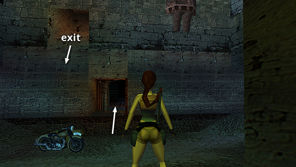 NOTE: If the doors are open and the Minotaur has escaped, either reload and try again or hop down off the ledge near the doorway. The Minotaur can't climb up or down, so Lara is safe here. Get on the motorcycle and ride back the way you came. When you come to the deep pit, jump across on the left side. (screenshot) Then continue around to the front of the CHAMBERS. Park the motorcycle below the chute, facing east, and re-enter the building. (screenshot) Wait for the Minotaur to come inside and climb onto one of the blocks flanking the entrance. Then climb back to the upper level, as described above, use the lever, and try the timed sequence again.