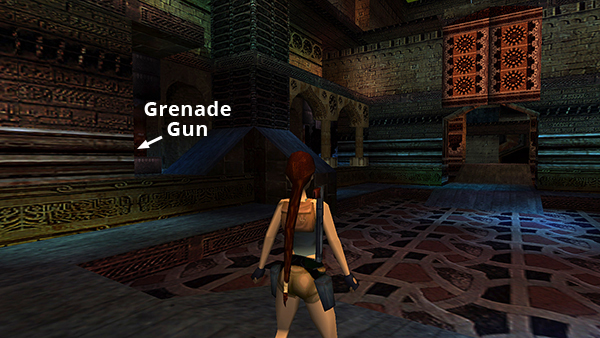 INSIDE THE CHAMBERS OF TULUN: Go under the arch into the main room. The first alcove on the left contains the GRENADE GUN (1) (or 10 grenades if you already have the weapon). (screenshot) There's a small medipack (2) in the far right alcove. (screenshot)