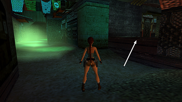 The purple surface on the wall ahead looks climbable but is not. So instead, walk to the corner and take a standing jump to the next striped awning on the left (north) side of the street. Then either take a standing jump down to the ledge below and just around the corner, or take a standing jump to grab the "real" ladder on the opposite wall. Climb around the corner to the left and drop onto the ledge below. Lara won't climb from the ladder onto the horizontal crevice to the left, so you'll need to find another way forward. (screenshots)