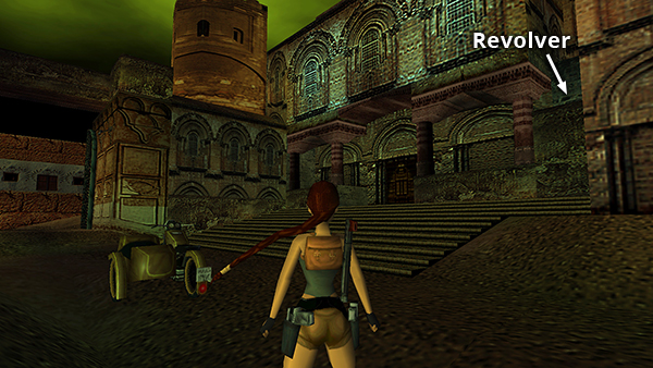 If you're missing the REVOLVER, follow the route above to get to the RUINED BUILDING WITH THE X-SHAPED WOODEN BARRICADES. Then continue along the street to the south, through a few twists and turns, and you'll soon arrive at the wide staircase near the start of the level. The revolver is in the raised alcove on the right side of the stairs. (screenshot)