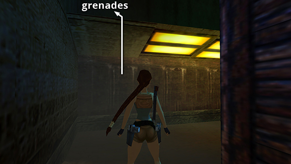 Once you've taken out the machine gun, pull up onto the ledge in the southeast corner, above the yellow fluorescent lights, to find some super grenades (4). (screenshot) Follow this ledge to the right, step down onto the sandbag wall below, and take a running jump to grab to the ledge above where the gun was. Pull up. Then drop through the hole into the tunnel below. (screenshot)