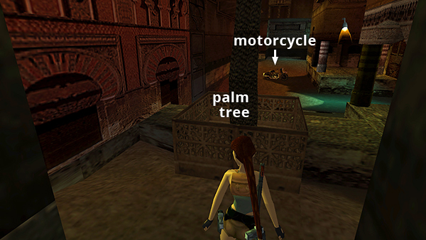 STREET WITH PALM TREE: Drive down one slope and up the next. Just ahead is a building with a low ledge and several striped columns. Stop here, dismount, and vault up onto the ledge with the columns to get some Uzi ammo (1). (screenshot) Continue eastward on foot, toward the low ledge with the big palm tree. Go through the doorway behind the palm tree into a narrow, sandy street. (screenshot)