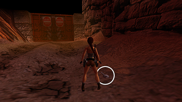 DIRT ROAD: Follow the road toward the big doors with the "Do Not Enter" signs. As you approach, 2 blue-robed baddies (1-2) emerge from a doorway on the right side of the road. If you advance gradually, you can get a lock on the first and fire with pistols while hopping away. (screenshot) He can't shoot while he's trying to follow Lara, so you won't take much damage. Then advance again and do the same with the second enemy, who drops a SILVER KEY(1). (screenshot) Use it in the keyhole to open the smaller door on the right side of the road. (screenshot)