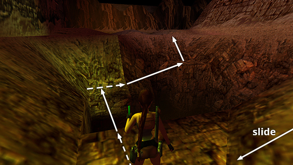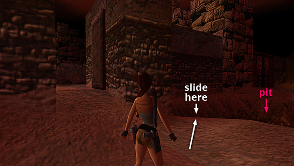 Now you're back at the metal door where you entered from the WALLED EXCAVATION AREA. Approach the angled edge on the left side of the next pit. Slide or jump down onto the ledge below. (screenshot) Take a running jump to the next ledge (also on the left side of the pit). Turn right and take a running jump to the ledge in the southwest corner. Turn left, walk to the bottom of the slope, and take a standing jump out of the pit. (screenshot)