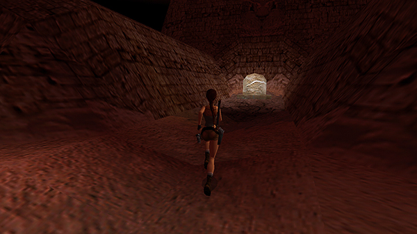 EXCAVATION PITS NEAR THE SPHINX: Outside the metal door is the fabled Sphinx, looking a little worse for wear in this pixelated 1999 incarnation. There are also deep pits on both sides of the door. Approach the pit to the right (north). Take a carefully angled running jump to the flat ledge on the left (west) side of the pit. (Or slide down the slope onto the ledge just below the rim of the pit. Then jump over to the ledge on the left.) From there take a running jump to grab the flat spot on the northeast rim of the pit. Pull up and continue forward (north). There's a roll-down door ahead on the right, but you can't open it yet. Proceed to the edge of the next pit. (screenshots)