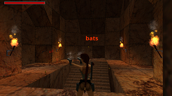 HALL WITH SWINGING BLADES: Head down the ramp, killing a bat (1) as you go. To get through the first swinging blade, position Lara at either side and run past the blade as it starts to swing away. (screenshot) Repeat the process for the second blade, then kill 2 more bats (2-3) in the room beyond. (screenshot)
