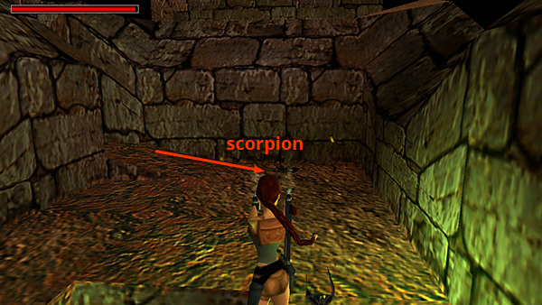 (15) SOUTHEAST CENTRAL MASTABA: Open the door of the building on the right (southwest), enter and kill 2 bats (49-50). Open the trapdoor and drop down into the tunnel. You might want to walk along this tunnel with pistols drawn, since Lara can probably see better than you do. You'll encounter 3 black scorpions as you go: The first scorpion (51) is just inside the tunnel. Turn left (north) at the first and only intersection. Continue to another scorpion (52) and, a little farther on, some revolver ammo (15) (green dot on map). Follow the tunnel back to the intersection, then go left (east). Kill another scorpion (53) and continue to an opening where you can climb out into another ruined mastaba.