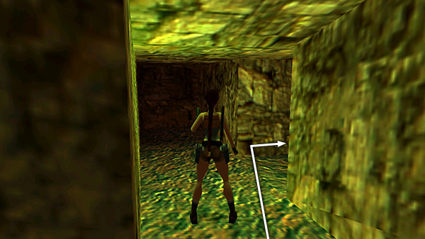 Return along the passage to the fork. This time, go right (north). Just ahead the passage jogs to the left. Beyond that, two separate passageways lead off to the left, each with a wild dog inside. (screenshot) I'd suggest running forward and taking the second left, killing the first dog (27), then backtracking to the other side passage. Kill the second dog (28) as it comes down the stairs toward you. Then go to the top and pick up a large medipack and revolver ammo (8-9) to the left and right (green dots on map). Return to the intersection and turn left, then left again. Continue to an opening where you can climb up.