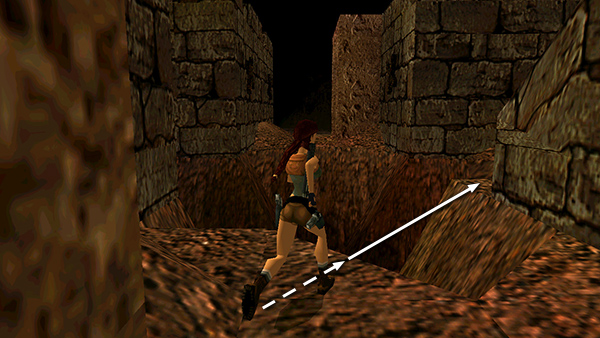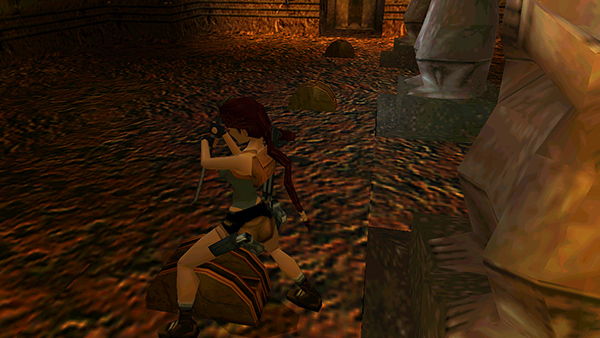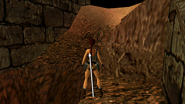 (14) NORTHEAST CENTRAL MASTABA: Kill a black scorpion (47) in the ruined building. Exit and kill another scorpion (48) outside. Turn left and walk forward along the edge of the excavation pit. Take a running jump across the pit to the left (north) rim, pressing the Left direction button in-flight if necessary to land the jump. Turn right and move to the edge so Lara is facing south across the pit. Take a running jump to grab the left side of the far edge. Pull up. (screenshots)