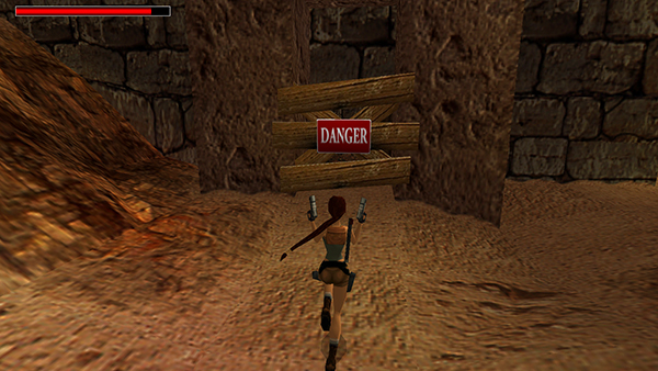 Before going on, turn around to face the building with the wooden barrier and 'DANGER' sign. (screenshot) Shoot the boards, enter the mastaba (#4 on the map), and kill a couple more giant beetles (7-8), one on the left and one on the right. Pick up Uzi clips and normal grenades (4-5) in the corners. Open the trapdoor and drop into the shallow pit to get a large medipack (6). Exit the way you came and approach the chasm separating this area from the PYRAMID.