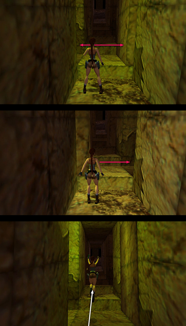To get from the north switch back to the shaft of light, exit the switch room, veer a little to the right, and jump into the water. Lara will land in the pool near where she picked up the amulet earlier. Swim forward then around to the left to get back to the southwest corner. Climb out on the same small, square ledge. Jump up the slope, turn left, and run up the ramp. This time, instead of going into the room with the switch, run past it and jump down to the uneven ledge in the southeast corner. Veer left as you run across this ledge. Take a running jump to grab the thin ledge protruding from the east wall above the water. Pull up, run forward, and jump to grab the slightly higher block directly ahead. Pull up again. Jump up the slope and turn left. (screenshots)