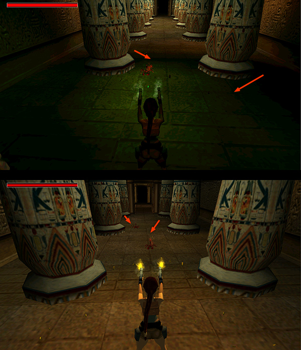 LONG ROOM WITH MANY DECORATIVE COLUMNS: Go through the doorway between the statues and follow the ramps down to the next room. As you advance along the aisle between the columns, 2 red scorpions (1-2) emerge, then 2 more (3-4) as you near the exit. They aren't venomous, but they will sting Lara if she doesn't kill them. (screenshots)