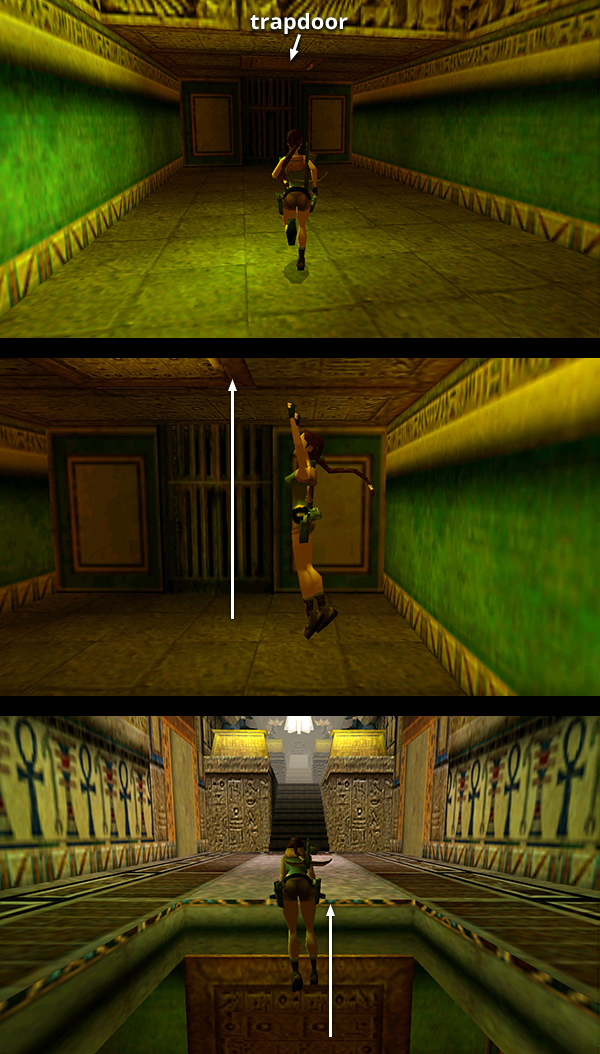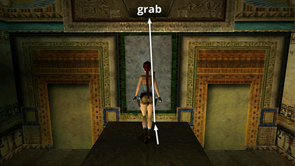 Walk to the edge of the block and take a standing jump to grab the small opening high on the south wall. (screenshot) Press Duck/Crouch + Up to crawl in. Crawl through until Lara can stand. Light a flare if you like, then continue down the hall past two alcoves containing sleeping mummies. As you round the next bend these mummies, along with a third mummy lying in the passageway ahead, come alive. You can't kill them with the weapons you have, so just run toward the light at the end of the hall. (screenshot) Once you drop down into the next room, they won't follow.