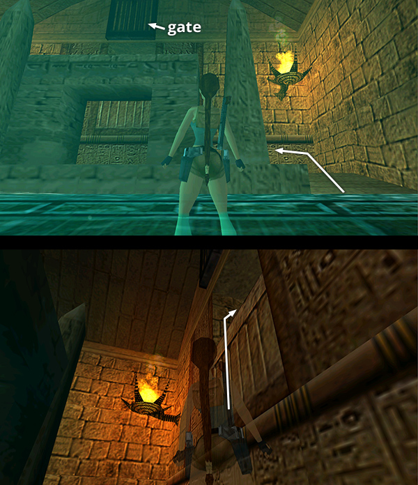 Swim down underneath the painted wall on the east side of the pool, below the entrance. On the underside of the ledge is a lever. Position Lara below it and press Action to pull it. (screenshots) This opens a gate on the other side of the pool. Swim across, climb out of the water, jump to grab the edge of the opening and pull up. (screenshots) Follow the passageway to the next room.
