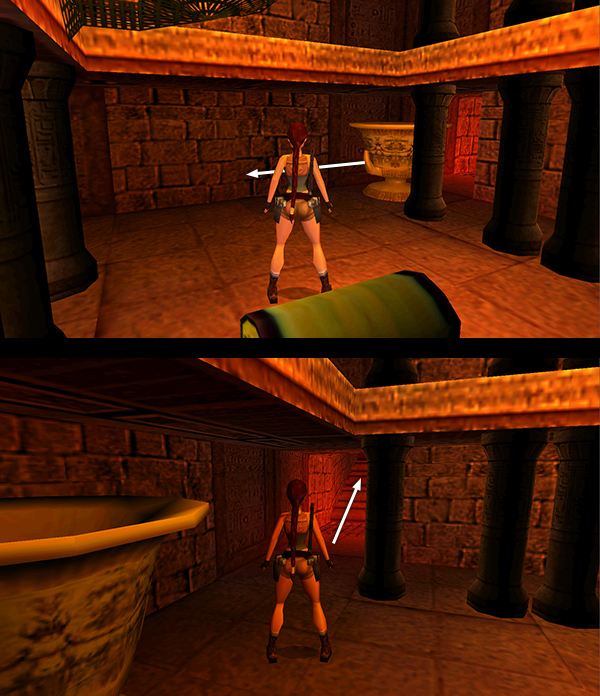 FIRST TREASURE ROOM: The jackals on either side of the entrance look suspicious, but they don't come to life...yet. Run up the ramp about halfway. Then climb onto either of the side walls. In the low, dark areas behind these walls, you'll find a large medipack, wideshot shells, a small medipack, and normal arrows for the CROSSBOW (7-10), which you don't have yet. (screenshots)