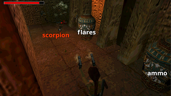 On the landing, shoot the first 2 jars to get revolver ammo and flares (18-19). The third jar contains a scorpion (14). Either avoid that jar it or stand back before breaking it so you can shoot the scorpion as it approaches. Continue down the other set of stairs. (screenshot)