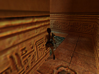 You can't see the spikes because they're behind Lara, but as she jumps, you'll see her get hung up inside the corner and sort of "hover" for a moment (as shown above). At this point, you'll hear the telltale "ching", indicating that a set of spikes has been triggered. When you've set off all three sets, the hallway is safe to pass.