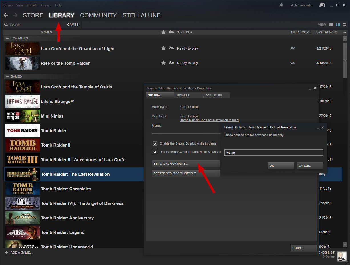 To access the Setup screen in the Steam version, open your Steam Library. Right-click on Tomb Raider: The Last Revelation and choose Properties. In the dialog box that pops up, select the General tab, then click Set Launch Options. Type "-setup" in the box (without the quotes) then click OK. (screenshot) Now when you run the game, the Setup window should appear. When you're done making the necessary tweaks, repeat these steps and remove the "-setup" command. Then you can run the game without having to go through that screen every time.