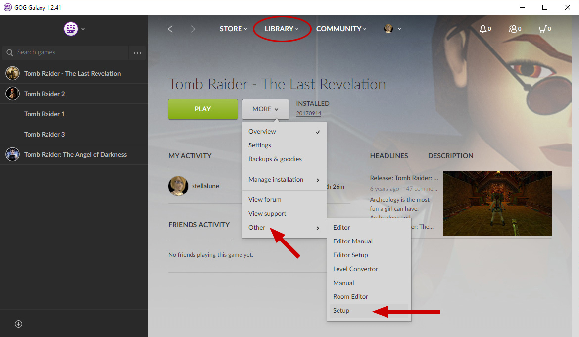To access the Setup screen in the GOG version, start by opening GOG Galaxy. In the Library section, select Tomb Raider: The Last Revelation. Click the 'More' button, then Other, then Setup. (screenshot)