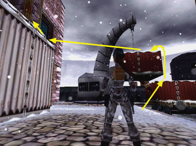 Go back outside. Climb onto the box on the train car. From there take a running jump to grab the crate hanging from the crane. Pull up. Then take a running jump onto the submarine.