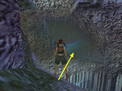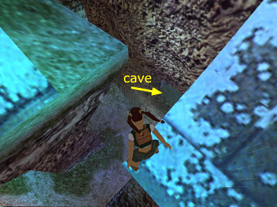 Climb onto the ledge and turn left to face the hollowed-out flat spot in the corner. Stand Lara at the outer corner of the ledge nearest the hollow. Take one walking step back from the edge. Then take a standing jump to a flat area on the rocks. Take another standing jump to the hollow. Pick up a small medipack (4). (This screenshot shows the right starting point and where to jump.)
