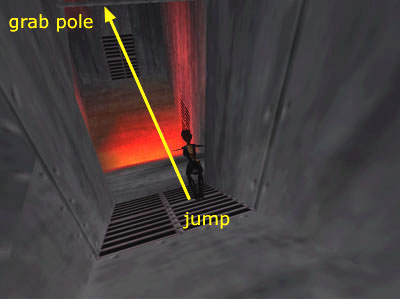 . . . jump and grab the horizontal pole above. The pole is difficult to see until Lara is actually hanging from it.