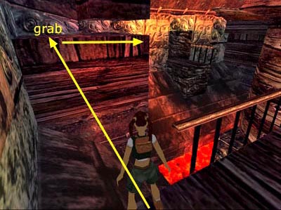 Turn left to face the break in the railing just inside the entrance. From here, take a running jump across the lava pool to grab the ledge in the corner. Don't pull up into the alcove. Instead traverse to the right. . .