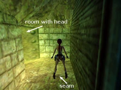 Position Lara on the seam between the floor textures just outside the doorway. (The room with the mechanical head is off to the left.) Sidestep to the right.