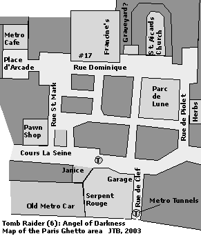 NOTES: This walkthrough covers the various maps that make up the Parisian Ghetto proper, along with several small but separate areas: the Café Metro, St. Aicard's Church, Willowtree Herbalist and Rennes' Pawnshop. I have combined them for convenience since you'll end up going back and forth between them. Due to their larger size, the Serpent Rouge nightclub, St. Aicard's Graveyard and Bouchard's Hideout are treated as separate levels.