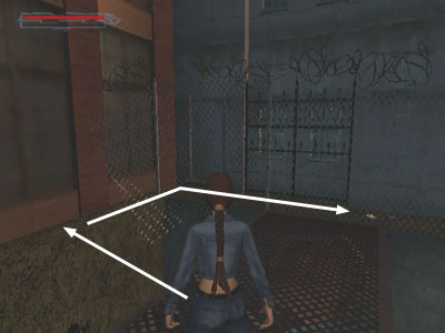 Return to the train car. Climb onto the pipe alongside it and jump up to grab the top of the car. Pull up, cross the top of the car and crawl under the large pipe to get a large health pack (1). Lara says, "I can climb that easily." Jump to grab the chain link fence on the wall and climb up and to the right. Drop onto the wide grating ledge.