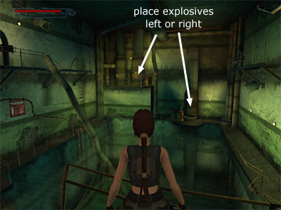 To blow up the right tank, follow the walkway along the edge of the pool and approach the large tank. Press Action to make Lara place the explosives. To blow up the left tank, swim across the pool and climb out using the ladder. Climb the ladder on the wall ahead and jump from the catwalk to the platform in front of the two tanks. Face the tank on the right and press Action. Lara places the explosives. (In either case, Lara says she'd better check the map to see if this is the right place, but it doesn't seem possible to actually access the map in your inventory.)
