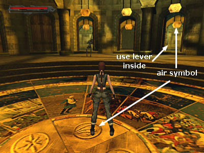 After stepping on the button with the Air symbol in the MAIN ROOM of the HALL OF SEASONS, the three Air doors open. Go through the right door and pull the lever (as shown in this screenshot). The portcullises blocking the inner hallway rise. Go through. The next door opens automatically, leading into the BREATH OF HADES level proper.