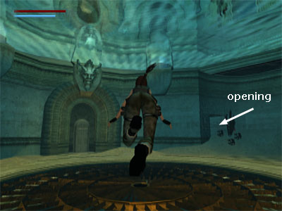 Swim down, then forward through a room with some fish swimming around in it. Swim into the small room ahead, avoiding the blades in the doorway. Pull the lever to raise the water level in the surrounding rooms. Swim back out past the blades and up through the hole where you came in. Climb out of the water. Return to the other room, where the fire knight is/was, and drop into the larger hole. Now that the water level is higher, Lara will splash down harmlessly.