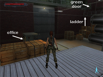Whether or not you confront the guards, you must then make your way to the far corner of the room and climb onto the stacked crates below the ladder (indicated in this screenshot). Step back from the wall and then jump straight up to grab the ladder. Climb all the way to the top. Then go through the green door to the right. (Skip the next paragraph.)