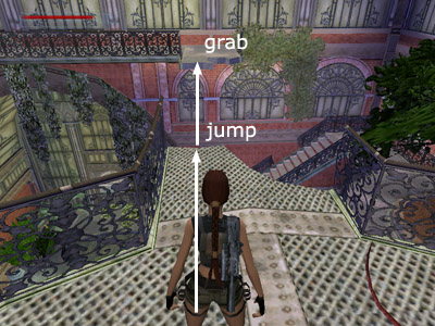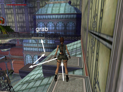 USEFUL BUG: To deal with the clawed mutant you encounter in the second greenhouse, run to the far end of the room and go up either set of stairs onto one of the ledges spanning the length of the room. Stand in any of the spots where the ledge juts out in a little semi-circular planter, or where the greenery texture grows out over the edge of the ledge. The best spots seem to be near the end of each long ledge where the greenery grows out and down the slope. Wait for the mutant to follow Lara. Then just before it reaches her, turn to face out over the room, step off the edge and slide down to the floor. If the bug works, the mutant will try to follow Lara but end up walking in mid-air, as shown in this screenshot. The mutant seems to imitate Lara, but it can't manage to slide as she does. So do not jump off the ledge, or the mutant will most likely jump down too. You may need to try this a few times in different places to make it work, but once the mutant is stuck, it will stay in that spot while you explore at your leisure. Special thanks to Peder for this strategy.