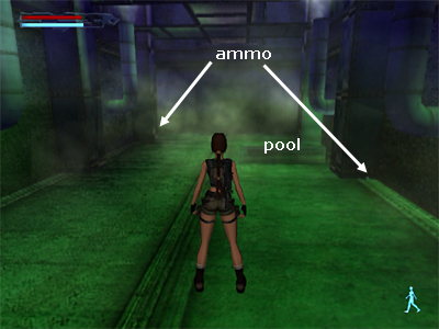 DARK AREA WITH STEAM PIPES & POISON GAS: Go down the stairs to a dark, greenish room. Continue down the short flight of steps to the left. This area is full of poison gas, so move quickly. Pick up 2 Vector clips (23-24)—one near the right wall just before the small pool, the other in the far left corner against the wall. (The locations are shown in this screenshot.)