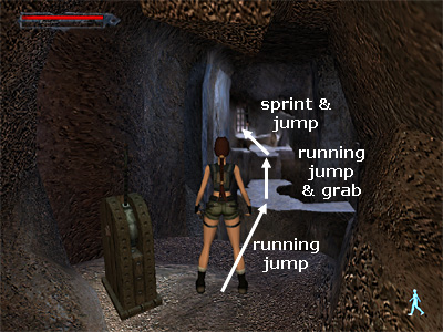 TIMED RUN: Turn right and follow the tunnel to another deep pit with tall stone pillars. In order to make the jumps required here, Lara must first have gotten the strength upgrade (see above). This series of jumps is illustrated in a screenshot.