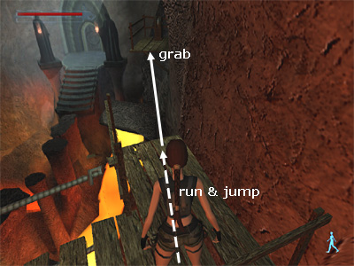 LAVA PIT WITH LEVER & WOODEN WALKWAY: Follow the passage. Where it splits, go to the right to a slope above a lava pit. You can't get the large health pack behind the bars just now. Slide down the slope and jump to land on the stone platform in the middle of the lava pit. The jump to the next pillar is a bit tricky. The short hop is hard to control on uneven surfaces. So instead position Lara several steps back from the edge, just behind the gap between the first and second pillars that make up this platform (as shown in this screenshot). Then take a standing jump to the next freestanding pillar. Walk to the edge and jump to the ledge with the lever. For some bizarre reason, the final jump gives Lara a lower-body strength upgrade. This upgrade also gives Lara the ability to do a special sprinting jump, which will be very useful shortly.