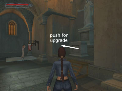 Find the movable stone block at the front of the church. Push it to the left to gain a lower-body strength upgrade. NOTE: In the PC version, at least, this upgrade does not seem to actually improve Lara's abilities in any way. If you get it before entering the Metro Tunnels, Lara will still be unable to kick down the door there.