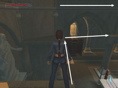 From that ledge you can grab the carved molding on the right and traverse along above the archways. When you reach the first small ledge, drop down to recharge Lara's grab meter. Then traverse to the next small ledge and get the small medipack.