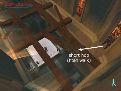 At the top, activate walk mode so Lara doesn't fall. Then turn to face out over the rafters. Take a short hop (a special jump done by holding Walk and pressing Jump without pressing Forward). This will prevent Lara from overshooting the rafter and falling.