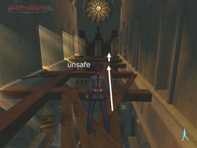 Make your way across the rafters to the organ bay on the other side. Be sure to go along the right side, since there are weak beams on the left side that will break under Lara's weight. Keep walk activated as you jump the gap, so Lara doesn't fall. Then drop down onto some wooden slats and from there to the floor fo the organ bay. You'll find a diamond ring on the floor in front of the organ. Climb back up to the rafters and return along the safe side (this time the left) to the ledge above the statue. Climb down to the floor.